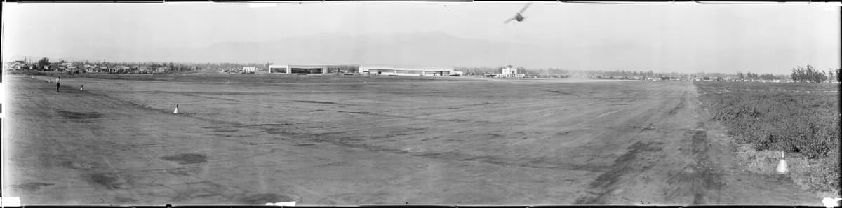 A panoramic view of the runway at United Airport in Burbank. The photograph was taken from the opposite side of the runway, facing the buildings and crowds. The white, Spanish-style terminal building is just left of center, with the Pacific Air Transport building to the left and two hangars to the right. There are numerous rows of airplanes parked on perpendicular runways on either side of the terminal building. The finding aid describes these airplanes as "military airplanes". There are hundreds of parked automobiles on the far right and left. Writing in white in the bottom, left of center, reads "No 4 Photo by ; F.M. Huddleston ; 4-26-1930".
