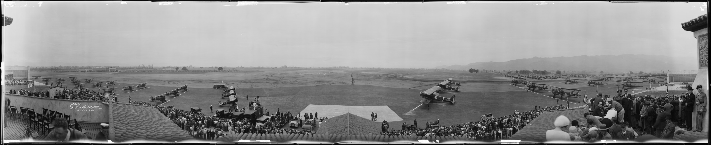 A panoramic view of the runway at United Airport in Burbank. The photograph was taken from the opposite side of the runway, facing the buildings and crowds. The white, Spanish-style terminal building is just left of center, with the Pacific Air Transport building to the left and two hangars to the right. There are numerous rows of airplanes parked on perpendicular runways on either side of the terminal building. The finding aid describes these airplanes as "military airplanes". There are hundreds of parked automobiles on the far right and left. Writing in white in the bottom, left of center, reads "No 4 Photo by ; F.M. Huddleston ; 4-26-1930".