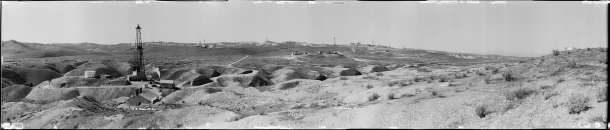 A panoramic view of the Kettleman Hills oil field in Kings County. There is oil rig in the center which has a few sheds nearby, and two circular storage tanks on the hill on the far left. A sign posted just in front of the derrick reads "Powell-Stockton ; Inv. Co. Ltd. ; No. 1.". The tops of five automobiles are visible above the crest of the hill, left of the oil rig, and there are a few men standing nearby. The surrounding land is dry and hilly, with only low scrub growing.
