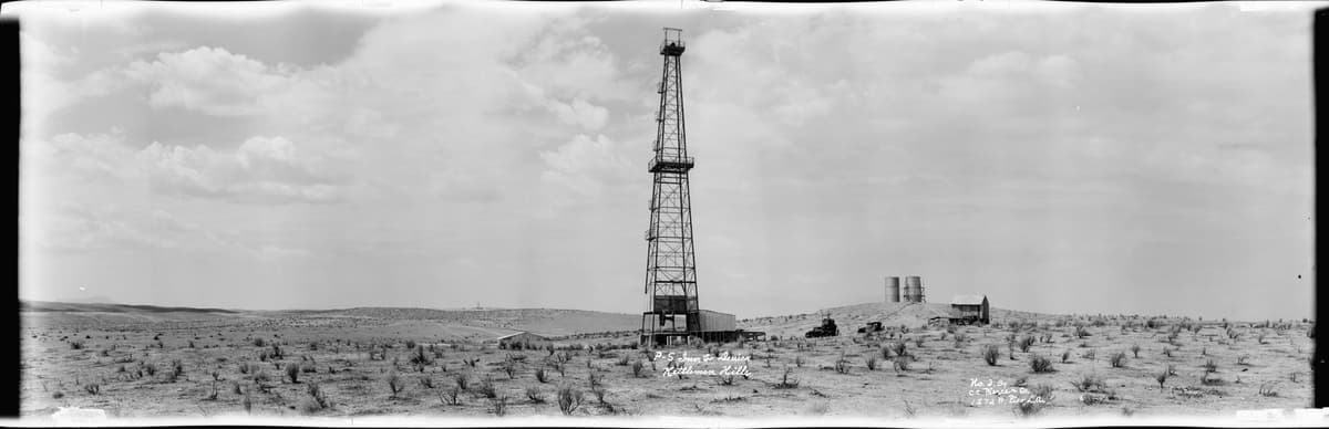 A panoramic view of the Kettleman Hills oil field in Kings County. There is oil rig in the center which has a few sheds nearby, and two circular storage tanks on the hill on the far left. A sign posted just in front of the derrick reads "Powell-Stockton ; Inv. Co. Ltd. ; No. 1.". The tops of five automobiles are visible above the crest of the hill, left of the oil rig, and there are a few men standing nearby. The surrounding land is dry and hilly, with only low scrub growing.