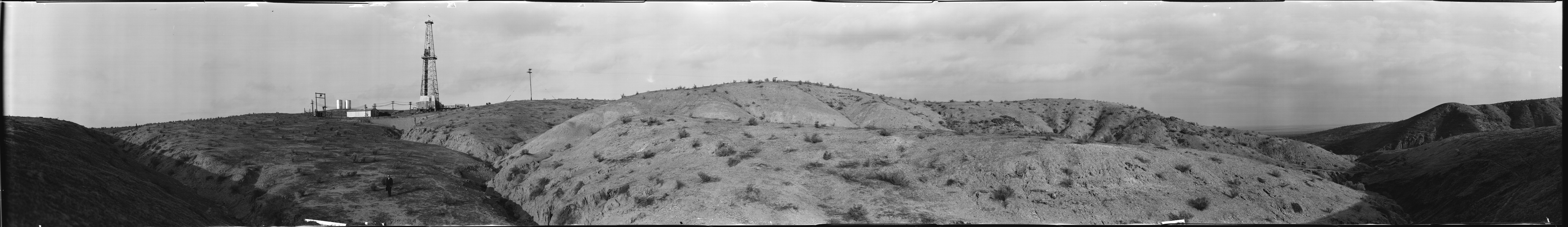 A panoramic view of the Kettleman Hills oil field in Kings County. There is oil rig in the center which has a few sheds nearby, and two circular storage tanks on the hill on the far left. A sign posted just in front of the derrick reads "Powell-Stockton ; Inv. Co. Ltd. ; No. 1.". The tops of five automobiles are visible above the crest of the hill, left of the oil rig, and there are a few men standing nearby. The surrounding land is dry and hilly, with only low scrub growing.