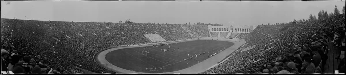 A panoramic view of the 1925 Rose Bowl Game between Notre Dame University and Stanford University at the Rose Bowl Stadium in Pasadena. The image is taken from the open end of the stadium (which was, at that time, horseshoe shaped), facing the field and the stands. The game is in progress at the near end of the field. The stands are almost completely full, and there are even more people sitting on the gravel hillside at the far left of the image. There is a tall speaker system at the near end of the field on the right. Writing in white in the center reads "Pasadena. ; Rose Bowl. ; Jan. 1. 1925. ; Notre Dame. 27. ; Stanford. 10." Writing in white in the bottom right reads "No. 100630 ; Aerograph Co. ; 1763 W Vernon Ave. ; LA."
