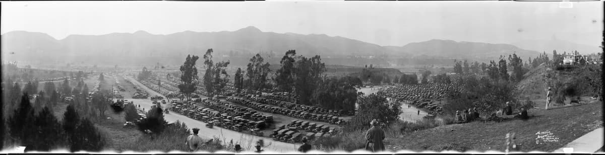 A slightly elevated panoramic view of hundreds of parked automobiles outside the Rose Bowl Stadium in Pasadena. The cars are parked in rows that have been marked out in white lines from the far left to the right. The large hill just left of center is the outside of the Rose Bowl Stadium, and some stands can be seen through the open end on the right (the stadium was shaped like a horseshoe at the time). Writing in white in the bottom center reads "Pasadena ; Tournament Day ; Jan. 1 1925." Writing in white in the bottom right corner reads "No 100632 ; Aerograph. Co ; 1763 West Vernon Ave ; L.A. Jan. 1. 1925."
