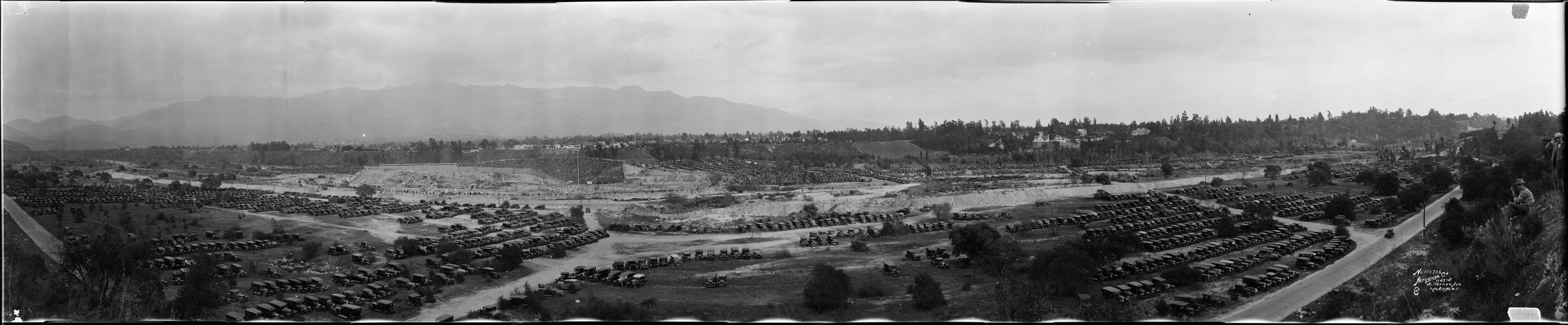 A slightly elevated panoramic view of hundreds of parked automobiles outside the Rose Bowl Stadium in Pasadena. The cars are parked in rows that have been marked out in white lines from the far left to the right. The large hill just left of center is the outside of the Rose Bowl Stadium, and some stands can be seen through the open end on the right (the stadium was shaped like a horseshoe at the time). Writing in white in the bottom center reads "Pasadena ; Tournament Day ; Jan. 1 1925." Writing in white in the bottom right corner reads "No 100632 ; Aerograph. Co ; 1763 West Vernon Ave ; L.A. Jan. 1. 1925."