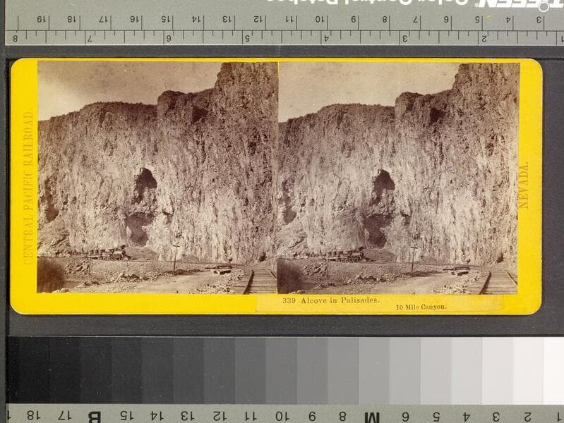 This collection contains 372 stereographic photographs (including some variants and duplicates) by photographer A. A. Hart that document the construction of the western half of first transcontinental railroad by the Central Pacific Railroad between 1864 and 1869. The collection includes all but seven of the original series, numbered from 1 to 364 by Hart (lacking 193, 323, 333, 358, 359, 362, and 364). The images chronicle the advancement of the railroad over 742 miles in California and the Sierra Nevada Mountains, Nevada, and Utah. The majority of the photographs are views of mountains, lakes, rivers, and forested areas (some with stumps from clear-cutting in the foreground), often with railroad tracks running through the center of the images. In addition, there are also images of locomotives, Chinese and other workers, equipment, bridges, tunnels, frontier and mining towns, construction camps, as well as some images of Native Americans, including Paiute and Shoshone Indians. The stereographs primarily contain Hart's own Sacramento imprint with series titles including: "Scenes in the Sierra Nevada Mountains"; "Scenes in the Valley of the Sacramento"; "Scenes in the Washoe Range"; "Scenes on the Humboldt River"; and "Scenes near Great Salt Lake". Interspersed in the collection are stereographs published without credit to Hart by Frank Durgan and Carleton E. Watkins.