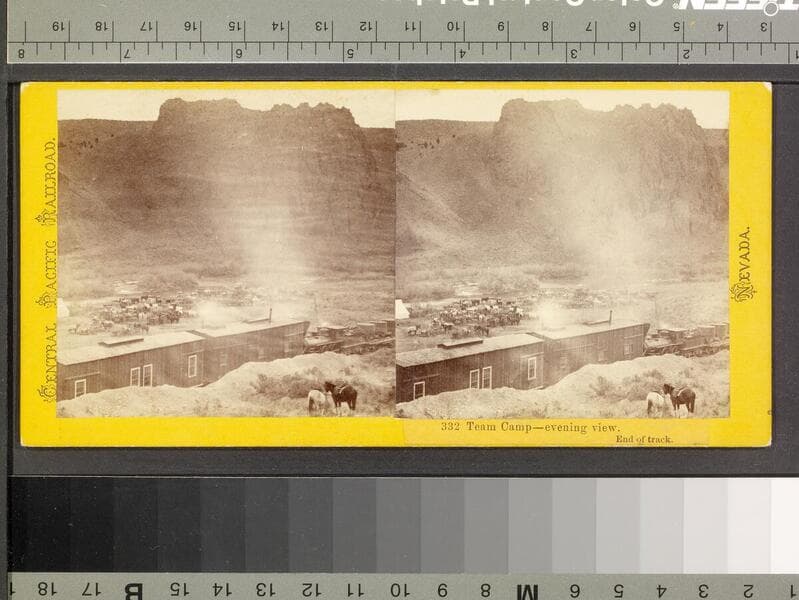 This collection contains 372 stereographic photographs (including some variants and duplicates) by photographer A. A. Hart that document the construction of the western half of first transcontinental railroad by the Central Pacific Railroad between 1864 and 1869. The collection includes all but seven of the original series, numbered from 1 to 364 by Hart (lacking 193, 323, 333, 358, 359, 362, and 364). The images chronicle the advancement of the railroad over 742 miles in California and the Sierra Nevada Mountains, Nevada, and Utah. The majority of the photographs are views of mountains, lakes, rivers, and forested areas (some with stumps from clear-cutting in the foreground), often with railroad tracks running through the center of the images. In addition, there are also images of locomotives, Chinese and other workers, equipment, bridges, tunnels, frontier and mining towns, construction camps, as well as some images of Native Americans, including Paiute and Shoshone Indians. The stereographs primarily contain Hart's own Sacramento imprint with series titles including: "Scenes in the Sierra Nevada Mountains"; "Scenes in the Valley of the Sacramento"; "Scenes in the Washoe Range"; "Scenes on the Humboldt River"; and "Scenes near Great Salt Lake". Interspersed in the collection are stereographs published without credit to Hart by Frank Durgan and Carleton E. Watkins.