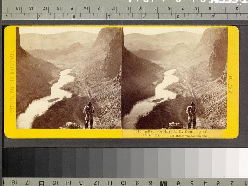 340. Indian viewing R. R. from top of Palisades. 435 Miles from Sacramento