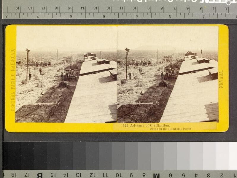 This collection contains 372 stereographic photographs (including some variants and duplicates) by photographer A. A. Hart that document the construction of the western half of first transcontinental railroad by the Central Pacific Railroad between 1864 and 1869. The collection includes all but seven of the original series, numbered from 1 to 364 by Hart (lacking 193, 323, 333, 358, 359, 362, and 364). The images chronicle the advancement of the railroad over 742 miles in California and the Sierra Nevada Mountains, Nevada, and Utah. The majority of the photographs are views of mountains, lakes, rivers, and forested areas (some with stumps from clear-cutting in the foreground), often with railroad tracks running through the center of the images. In addition, there are also images of locomotives, Chinese and other workers, equipment, bridges, tunnels, frontier and mining towns, construction camps, as well as some images of Native Americans, including Paiute and Shoshone Indians. The stereographs primarily contain Hart's own Sacramento imprint with series titles including: "Scenes in the Sierra Nevada Mountains"; "Scenes in the Valley of the Sacramento"; "Scenes in the Washoe Range"; "Scenes on the Humboldt River"; and "Scenes near Great Salt Lake". Interspersed in the collection are stereographs published without credit to Hart by Frank Durgan and Carleton E. Watkins.