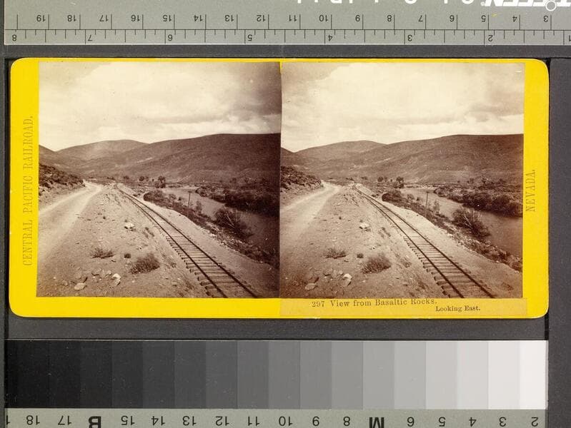 This collection contains 372 stereographic photographs (including some variants and duplicates) by photographer A. A. Hart that document the construction of the western half of first transcontinental railroad by the Central Pacific Railroad between 1864 and 1869. The collection includes all but seven of the original series, numbered from 1 to 364 by Hart (lacking 193, 323, 333, 358, 359, 362, and 364). The images chronicle the advancement of the railroad over 742 miles in California and the Sierra Nevada Mountains, Nevada, and Utah. The majority of the photographs are views of mountains, lakes, rivers, and forested areas (some with stumps from clear-cutting in the foreground), often with railroad tracks running through the center of the images. In addition, there are also images of locomotives, Chinese and other workers, equipment, bridges, tunnels, frontier and mining towns, construction camps, as well as some images of Native Americans, including Paiute and Shoshone Indians. The stereographs primarily contain Hart's own Sacramento imprint with series titles including: "Scenes in the Sierra Nevada Mountains"; "Scenes in the Valley of the Sacramento"; "Scenes in the Washoe Range"; "Scenes on the Humboldt River"; and "Scenes near Great Salt Lake". Interspersed in the collection are stereographs published without credit to Hart by Frank Durgan and Carleton E. Watkins.