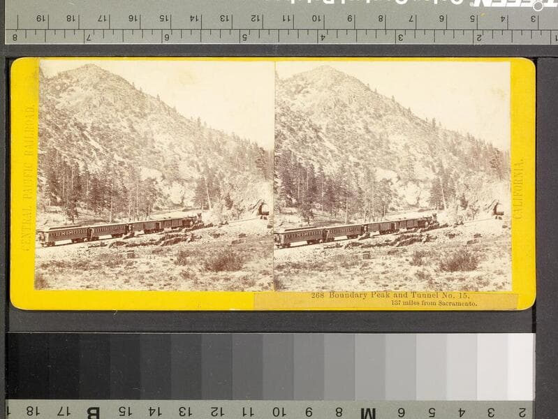 This collection contains 372 stereographic photographs (including some variants and duplicates) by photographer A. A. Hart that document the construction of the western half of first transcontinental railroad by the Central Pacific Railroad between 1864 and 1869. The collection includes all but seven of the original series, numbered from 1 to 364 by Hart (lacking 193, 323, 333, 358, 359, 362, and 364). The images chronicle the advancement of the railroad over 742 miles in California and the Sierra Nevada Mountains, Nevada, and Utah. The majority of the photographs are views of mountains, lakes, rivers, and forested areas (some with stumps from clear-cutting in the foreground), often with railroad tracks running through the center of the images. In addition, there are also images of locomotives, Chinese and other workers, equipment, bridges, tunnels, frontier and mining towns, construction camps, as well as some images of Native Americans, including Paiute and Shoshone Indians. The stereographs primarily contain Hart's own Sacramento imprint with series titles including: "Scenes in the Sierra Nevada Mountains"; "Scenes in the Valley of the Sacramento"; "Scenes in the Washoe Range"; "Scenes on the Humboldt River"; and "Scenes near Great Salt Lake". Interspersed in the collection are stereographs published without credit to Hart by Frank Durgan and Carleton E. Watkins.