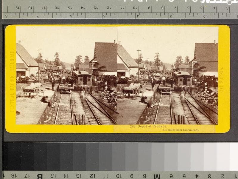 This collection contains 372 stereographic photographs (including some variants and duplicates) by photographer A. A. Hart that document the construction of the western half of first transcontinental railroad by the Central Pacific Railroad between 1864 and 1869. The collection includes all but seven of the original series, numbered from 1 to 364 by Hart (lacking 193, 323, 333, 358, 359, 362, and 364). The images chronicle the advancement of the railroad over 742 miles in California and the Sierra Nevada Mountains, Nevada, and Utah. The majority of the photographs are views of mountains, lakes, rivers, and forested areas (some with stumps from clear-cutting in the foreground), often with railroad tracks running through the center of the images. In addition, there are also images of locomotives, Chinese and other workers, equipment, bridges, tunnels, frontier and mining towns, construction camps, as well as some images of Native Americans, including Paiute and Shoshone Indians. The stereographs primarily contain Hart's own Sacramento imprint with series titles including: "Scenes in the Sierra Nevada Mountains"; "Scenes in the Valley of the Sacramento"; "Scenes in the Washoe Range"; "Scenes on the Humboldt River"; and "Scenes near Great Salt Lake". Interspersed in the collection are stereographs published without credit to Hart by Frank Durgan and Carleton E. Watkins.
