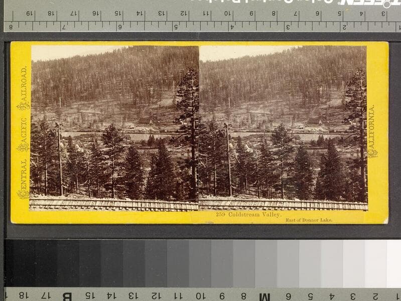 This collection contains 372 stereographic photographs (including some variants and duplicates) by photographer A. A. Hart that document the construction of the western half of first transcontinental railroad by the Central Pacific Railroad between 1864 and 1869. The collection includes all but seven of the original series, numbered from 1 to 364 by Hart (lacking 193, 323, 333, 358, 359, 362, and 364). The images chronicle the advancement of the railroad over 742 miles in California and the Sierra Nevada Mountains, Nevada, and Utah. The majority of the photographs are views of mountains, lakes, rivers, and forested areas (some with stumps from clear-cutting in the foreground), often with railroad tracks running through the center of the images. In addition, there are also images of locomotives, Chinese and other workers, equipment, bridges, tunnels, frontier and mining towns, construction camps, as well as some images of Native Americans, including Paiute and Shoshone Indians. The stereographs primarily contain Hart's own Sacramento imprint with series titles including: "Scenes in the Sierra Nevada Mountains"; "Scenes in the Valley of the Sacramento"; "Scenes in the Washoe Range"; "Scenes on the Humboldt River"; and "Scenes near Great Salt Lake". Interspersed in the collection are stereographs published without credit to Hart by Frank Durgan and Carleton E. Watkins.