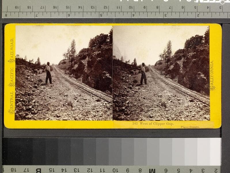 This collection contains 372 stereographic photographs (including some variants and duplicates) by photographer A. A. Hart that document the construction of the western half of first transcontinental railroad by the Central Pacific Railroad between 1864 and 1869. The collection includes all but seven of the original series, numbered from 1 to 364 by Hart (lacking 193, 323, 333, 358, 359, 362, and 364). The images chronicle the advancement of the railroad over 742 miles in California and the Sierra Nevada Mountains, Nevada, and Utah. The majority of the photographs are views of mountains, lakes, rivers, and forested areas (some with stumps from clear-cutting in the foreground), often with railroad tracks running through the center of the images. In addition, there are also images of locomotives, Chinese and other workers, equipment, bridges, tunnels, frontier and mining towns, construction camps, as well as some images of Native Americans, including Paiute and Shoshone Indians. The stereographs primarily contain Hart's own Sacramento imprint with series titles including: "Scenes in the Sierra Nevada Mountains"; "Scenes in the Valley of the Sacramento"; "Scenes in the Washoe Range"; "Scenes on the Humboldt River"; and "Scenes near Great Salt Lake". Interspersed in the collection are stereographs published without credit to Hart by Frank Durgan and Carleton E. Watkins.