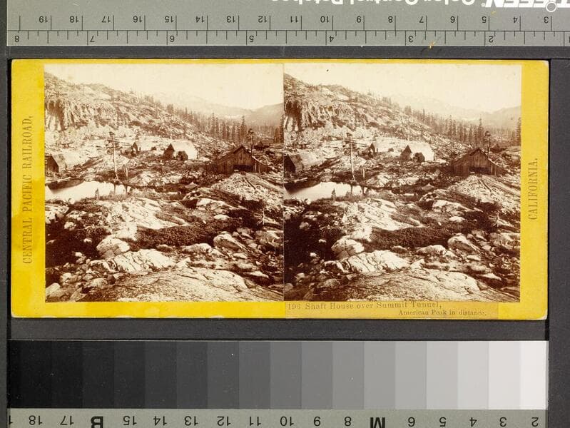 This collection contains 372 stereographic photographs (including some variants and duplicates) by photographer A. A. Hart that document the construction of the western half of first transcontinental railroad by the Central Pacific Railroad between 1864 and 1869. The collection includes all but seven of the original series, numbered from 1 to 364 by Hart (lacking 193, 323, 333, 358, 359, 362, and 364). The images chronicle the advancement of the railroad over 742 miles in California and the Sierra Nevada Mountains, Nevada, and Utah. The majority of the photographs are views of mountains, lakes, rivers, and forested areas (some with stumps from clear-cutting in the foreground), often with railroad tracks running through the center of the images. In addition, there are also images of locomotives, Chinese and other workers, equipment, bridges, tunnels, frontier and mining towns, construction camps, as well as some images of Native Americans, including Paiute and Shoshone Indians. The stereographs primarily contain Hart's own Sacramento imprint with series titles including: "Scenes in the Sierra Nevada Mountains"; "Scenes in the Valley of the Sacramento"; "Scenes in the Washoe Range"; "Scenes on the Humboldt River"; and "Scenes near Great Salt Lake". Interspersed in the collection are stereographs published without credit to Hart by Frank Durgan and Carleton E. Watkins.