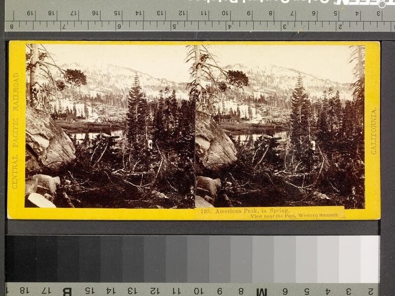 This collection contains 372 stereographic photographs (including some variants and duplicates) by photographer A. A. Hart that document the construction of the western half of first transcontinental railroad by the Central Pacific Railroad between 1864 and 1869. The collection includes all but seven of the original series, numbered from 1 to 364 by Hart (lacking 193, 323, 333, 358, 359, 362, and 364). The images chronicle the advancement of the railroad over 742 miles in California and the Sierra Nevada Mountains, Nevada, and Utah. The majority of the photographs are views of mountains, lakes, rivers, and forested areas (some with stumps from clear-cutting in the foreground), often with railroad tracks running through the center of the images. In addition, there are also images of locomotives, Chinese and other workers, equipment, bridges, tunnels, frontier and mining towns, construction camps, as well as some images of Native Americans, including Paiute and Shoshone Indians. The stereographs primarily contain Hart's own Sacramento imprint with series titles including: "Scenes in the Sierra Nevada Mountains"; "Scenes in the Valley of the Sacramento"; "Scenes in the Washoe Range"; "Scenes on the Humboldt River"; and "Scenes near Great Salt Lake". Interspersed in the collection are stereographs published without credit to Hart by Frank Durgan and Carleton E. Watkins.