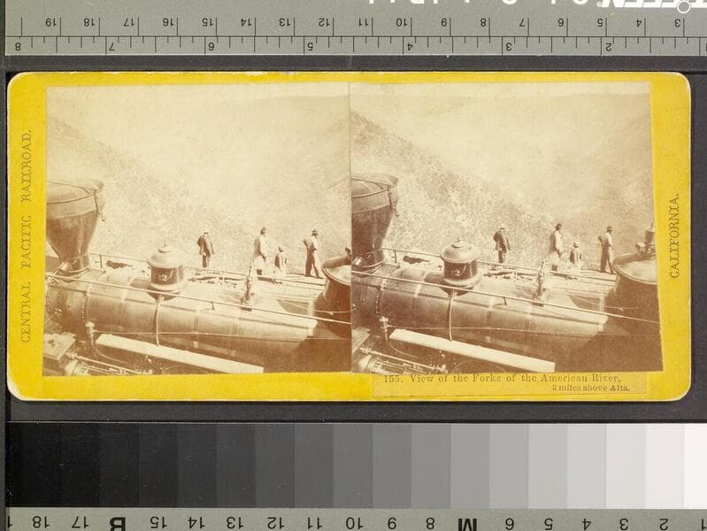 This collection contains 372 stereographic photographs (including some variants and duplicates) by photographer A. A. Hart that document the construction of the western half of first transcontinental railroad by the Central Pacific Railroad between 1864 and 1869. The collection includes all but seven of the original series, numbered from 1 to 364 by Hart (lacking 193, 323, 333, 358, 359, 362, and 364). The images chronicle the advancement of the railroad over 742 miles in California and the Sierra Nevada Mountains, Nevada, and Utah. The majority of the photographs are views of mountains, lakes, rivers, and forested areas (some with stumps from clear-cutting in the foreground), often with railroad tracks running through the center of the images. In addition, there are also images of locomotives, Chinese and other workers, equipment, bridges, tunnels, frontier and mining towns, construction camps, as well as some images of Native Americans, including Paiute and Shoshone Indians. The stereographs primarily contain Hart's own Sacramento imprint with series titles including: "Scenes in the Sierra Nevada Mountains"; "Scenes in the Valley of the Sacramento"; "Scenes in the Washoe Range"; "Scenes on the Humboldt River"; and "Scenes near Great Salt Lake". Interspersed in the collection are stereographs published without credit to Hart by Frank Durgan and Carleton E. Watkins.