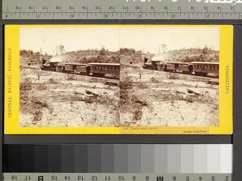 This collection contains 372 stereographic photographs (including some variants and duplicates) by photographer A. A. Hart that document the construction of the western half of first transcontinental railroad by the Central Pacific Railroad between 1864 and 1869. The collection includes all but seven of the original series, numbered from 1 to 364 by Hart (lacking 193, 323, 333, 358, 359, 362, and 364). The images chronicle the advancement of the railroad over 742 miles in California and the Sierra Nevada Mountains, Nevada, and Utah. The majority of the photographs are views of mountains, lakes, rivers, and forested areas (some with stumps from clear-cutting in the foreground), often with railroad tracks running through the center of the images. In addition, there are also images of locomotives, Chinese and other workers, equipment, bridges, tunnels, frontier and mining towns, construction camps, as well as some images of Native Americans, including Paiute and Shoshone Indians. The stereographs primarily contain Hart's own Sacramento imprint with series titles including: "Scenes in the Sierra Nevada Mountains"; "Scenes in the Valley of the Sacramento"; "Scenes in the Washoe Range"; "Scenes on the Humboldt River"; and "Scenes near Great Salt Lake". Interspersed in the collection are stereographs published without credit to Hart by Frank Durgan and Carleton E. Watkins.
