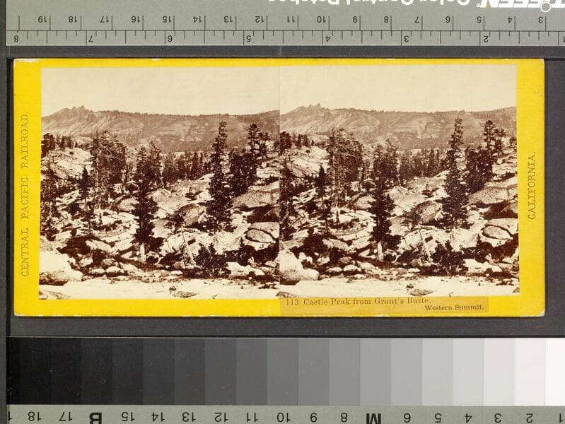 This collection contains 372 stereographic photographs (including some variants and duplicates) by photographer A. A. Hart that document the construction of the western half of first transcontinental railroad by the Central Pacific Railroad between 1864 and 1869. The collection includes all but seven of the original series, numbered from 1 to 364 by Hart (lacking 193, 323, 333, 358, 359, 362, and 364). The images chronicle the advancement of the railroad over 742 miles in California and the Sierra Nevada Mountains, Nevada, and Utah. The majority of the photographs are views of mountains, lakes, rivers, and forested areas (some with stumps from clear-cutting in the foreground), often with railroad tracks running through the center of the images. In addition, there are also images of locomotives, Chinese and other workers, equipment, bridges, tunnels, frontier and mining towns, construction camps, as well as some images of Native Americans, including Paiute and Shoshone Indians. The stereographs primarily contain Hart's own Sacramento imprint with series titles including: "Scenes in the Sierra Nevada Mountains"; "Scenes in the Valley of the Sacramento"; "Scenes in the Washoe Range"; "Scenes on the Humboldt River"; and "Scenes near Great Salt Lake". Interspersed in the collection are stereographs published without credit to Hart by Frank Durgan and Carleton E. Watkins.