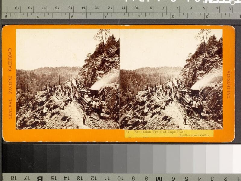 This collection contains 372 stereographic photographs (including some variants and duplicates) by photographer A. A. Hart that document the construction of the western half of first transcontinental railroad by the Central Pacific Railroad between 1864 and 1869. The collection includes all but seven of the original series, numbered from 1 to 364 by Hart (lacking 193, 323, 333, 358, 359, 362, and 364). The images chronicle the advancement of the railroad over 742 miles in California and the Sierra Nevada Mountains, Nevada, and Utah. The majority of the photographs are views of mountains, lakes, rivers, and forested areas (some with stumps from clear-cutting in the foreground), often with railroad tracks running through the center of the images. In addition, there are also images of locomotives, Chinese and other workers, equipment, bridges, tunnels, frontier and mining towns, construction camps, as well as some images of Native Americans, including Paiute and Shoshone Indians. The stereographs primarily contain Hart's own Sacramento imprint with series titles including: "Scenes in the Sierra Nevada Mountains"; "Scenes in the Valley of the Sacramento"; "Scenes in the Washoe Range"; "Scenes on the Humboldt River"; and "Scenes near Great Salt Lake". Interspersed in the collection are stereographs published without credit to Hart by Frank Durgan and Carleton E. Watkins.