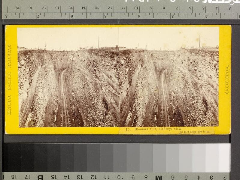 This collection contains 372 stereographic photographs (including some variants and duplicates) by photographer A. A. Hart that document the construction of the western half of first transcontinental railroad by the Central Pacific Railroad between 1864 and 1869. The collection includes all but seven of the original series, numbered from 1 to 364 by Hart (lacking 193, 323, 333, 358, 359, 362, and 364). The images chronicle the advancement of the railroad over 742 miles in California and the Sierra Nevada Mountains, Nevada, and Utah. The majority of the photographs are views of mountains, lakes, rivers, and forested areas (some with stumps from clear-cutting in the foreground), often with railroad tracks running through the center of the images. In addition, there are also images of locomotives, Chinese and other workers, equipment, bridges, tunnels, frontier and mining towns, construction camps, as well as some images of Native Americans, including Paiute and Shoshone Indians. The stereographs primarily contain Hart's own Sacramento imprint with series titles including: "Scenes in the Sierra Nevada Mountains"; "Scenes in the Valley of the Sacramento"; "Scenes in the Washoe Range"; "Scenes on the Humboldt River"; and "Scenes near Great Salt Lake". Interspersed in the collection are stereographs published without credit to Hart by Frank Durgan and Carleton E. Watkins.