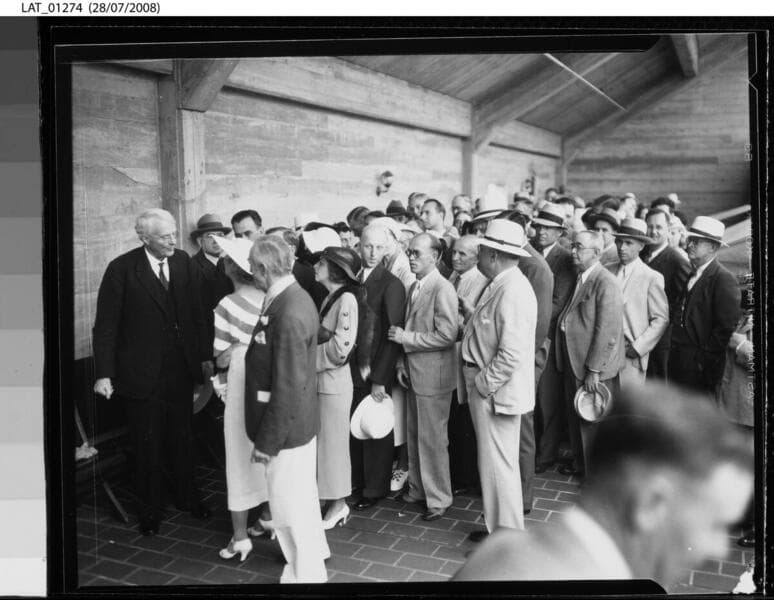 Black and white photograph of guests mingling at Harry Chandler's 70th birthday party outdoors on the roof terrace of the Los Angeles Times building.