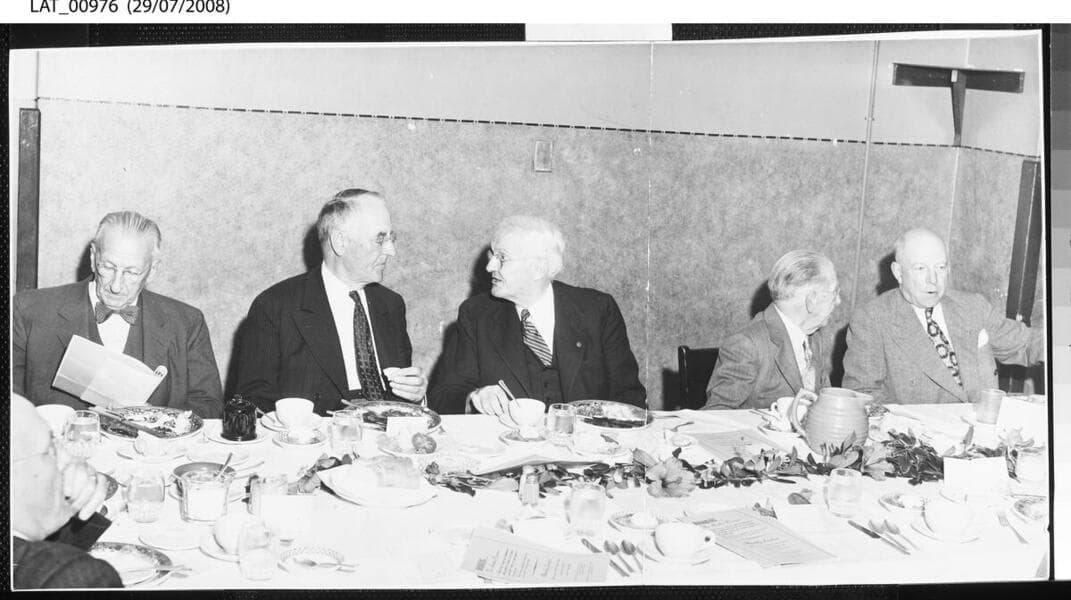 Black and white photograph of Harry Chandler (far left) eating at a dining table with others. Pictured (L to R) are Harry Chandler, Paul Shoup, Gilbert Bessmeyer and R.W. Pridham.
