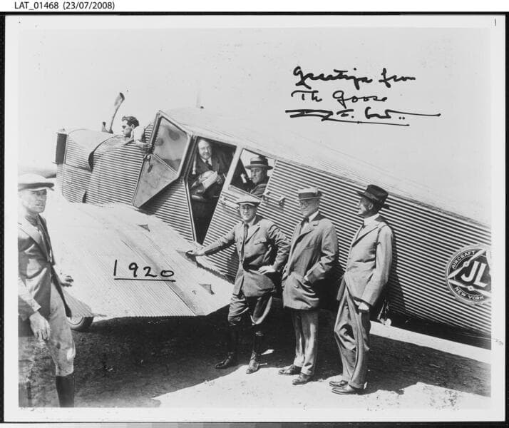 Black and white photograph. Harry Chandler (3rd from L) poses outdoors near a doorway with a group of men including Samuel Goldwyn (2nd from R). Ruth Crocker Collection.