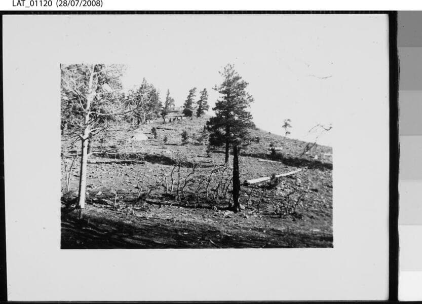 Black and white photograph. View of mountain slope on Vermejo Ranch with elk in distance. Note on verso reads, "Some elk on Venado Creek."