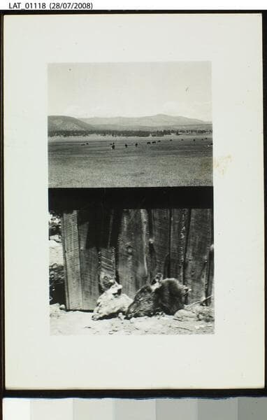 Black and white photograph. View of mountain slope on Vermejo Ranch with elk in distance. Note on verso reads, "Some elk on Venado Creek."