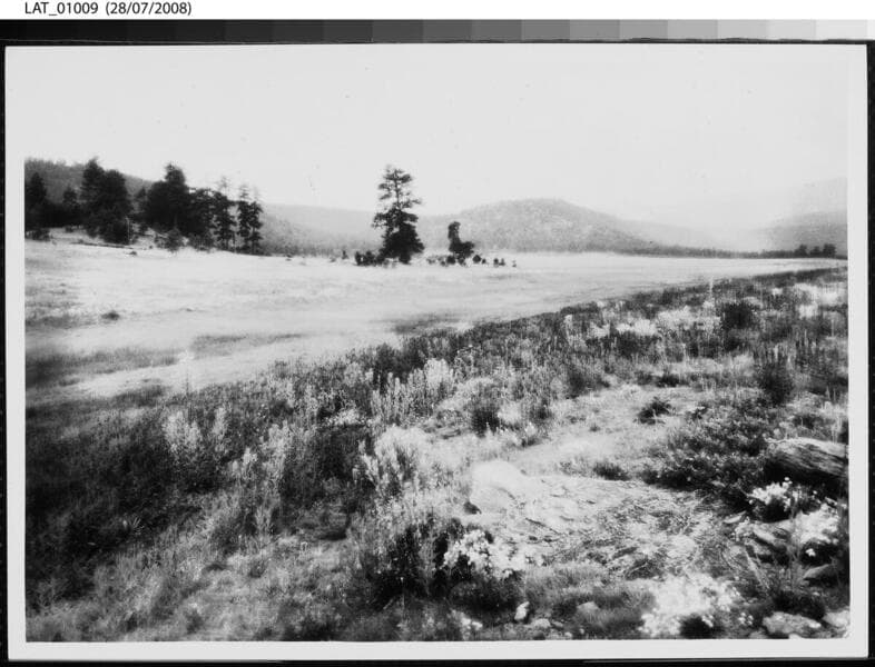 Black and white photograph taken at Vermejo Ranch. Slope with scattered flowers in foreground, tall pines in middle distance, wide valley beyond.