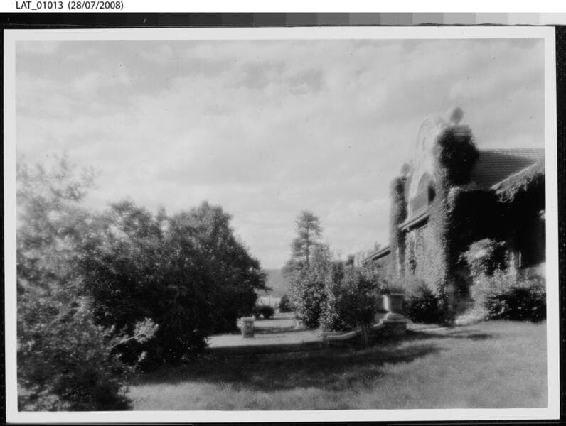 Black and white photograph. Exterior view of the 3-story lodge known as "Norman's House" or the "Guest House," so named because of the Bartlett family's use of the property during their ownership in the early 1900s. This photo of the 27-bedroom mansion shows the building's stone exterior and ivy-covered walls. Lawn and bushes can be seen in the foreground. The structure burned to the ground in 1955.