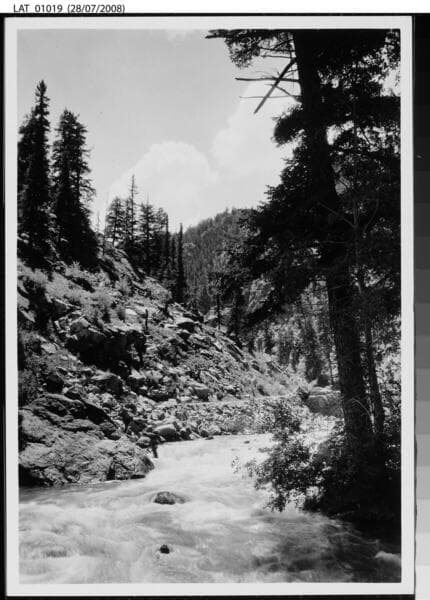 Black and white photograph. View of a small river flowing down a narrow valley, dirt road visible on left bank. Rocky outcroppings and driftwood visible in foreground.