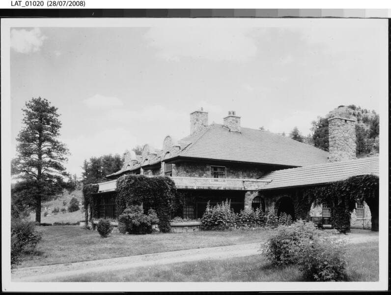 Black and white photograph. View of lodge at right, gazebo / summerhouse at lower center, wide valley beyond.
