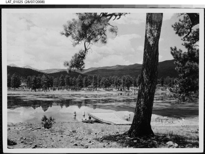 Black and white photograph. View of pilings in the shallow part of a lake. Tall tree on one side of the bank, forest in the distance.
