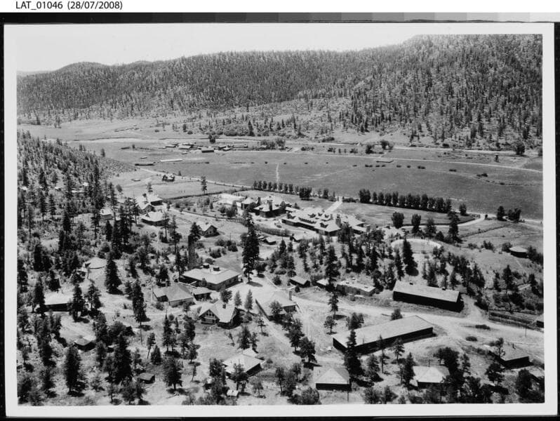 Black and white photograph taken at Vermejo Ranch. Caption on verso reads: "From top of high peak behind Costilla Lodge looking southwest."