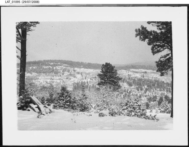 Black and white photograph taken at Vermejo Ranch. Slope with scattered flowers in foreground, tall pines in middle distance, wide valley beyond.