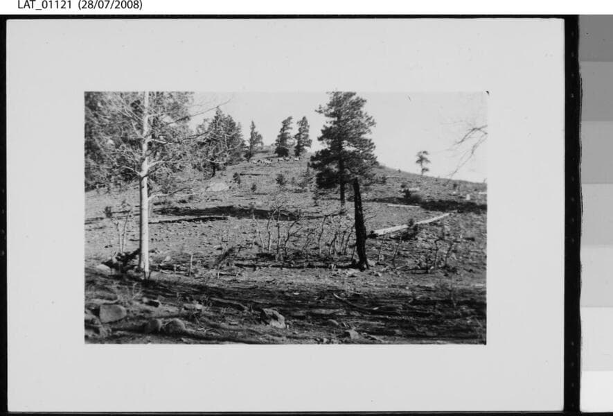 Black and white photograph. View of mountain slope with elk in the distance. Note on verso reads, "Band of elk on Venado Creek."