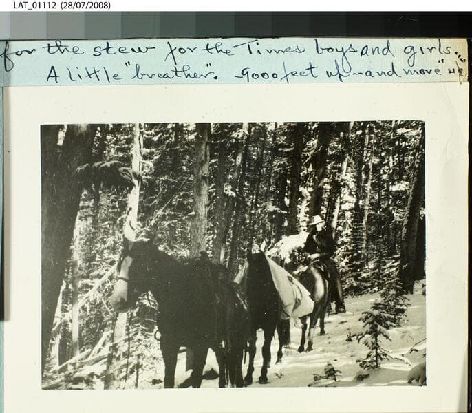 Sheet of heavy blue paper titled, "Bringing back 'sumpin' for the stew for the Times boys and girls." 5 black and white photographs attached, bottom right caption reads: "Coming down Ash Mountain - snow storm coming up." One horse looking back over shoulder with snowy valley ahead of it.
