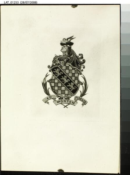 Black and white photograph of the title page from the Harry Chandler book of appreciation from the Times employees on the occasion of the 50th anniversary of the newspaper. Inside an embossed shield border in ornate font are the words "Tribute of Appreciation to Harry Chandler on the Golden Anniversary of the founding of The Times from a group of his coworkers." May Goodan Collection.
