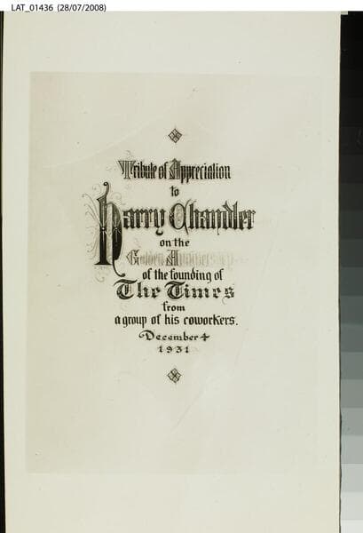 Black and white photograph of the dedication page from the Harry Chandler book of appreciation from the Times employees on the occasion of the 50th anniversary of the newspaper. Inside an embossed shield border in ornate font are the words "To Harry Chandler." May Goodan Collection.