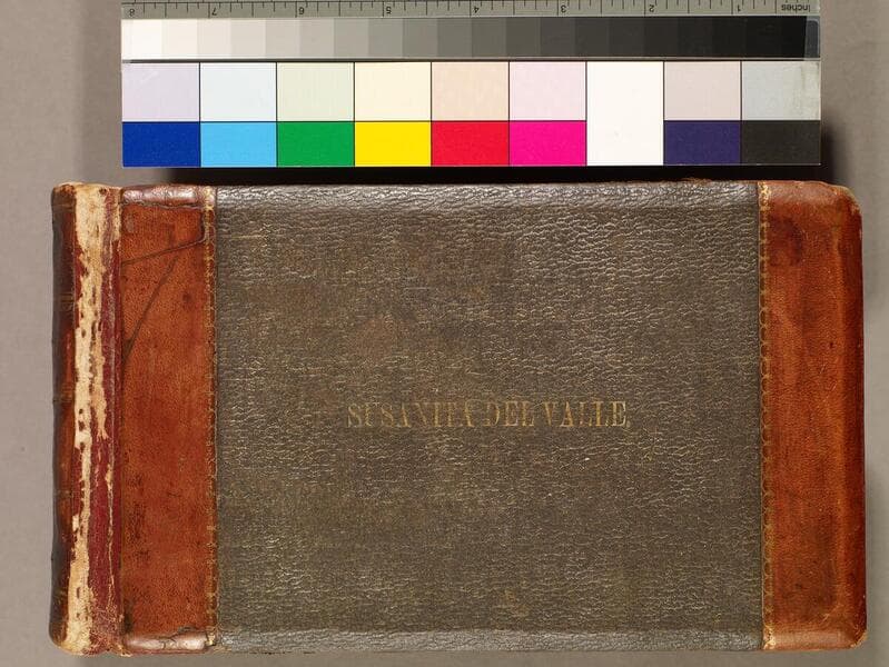 The photograph album chronicles Charles F. Lummis's time with the Del Valle family at Rancho Camulos in Ventura County, California, from 1887 to 1888. There are many photographs of the Del Valle family, particularly the Del Valle daughters, with whom Lummis is shown playfully interacting. Family gatherings include a local Catholic priest, couples dancing, and young women playing instruments. Views of Rancho Camulos, the surrounding landscape, and architectural features such as the placita, the chapel, and the south veranda, are also prominently featured. The front cover of the photograph album bears the embossed title of "Susanita Del Valle," while the spine's title says, "Views of Camulos." An inscription on the third page reads: "Susanita Del Valle, with the best wishes of Chas. F. Lummis—Feb. 3, 1888." Some of the pictures appear in The Home of Ramona: Photographs of Camulos, the Fine Old Spanish Estate Described by Mrs. Helen Hunt Jackson, as the Home of "Ramona," by Charles F. Lummis, published in Los Angeles in 1888. The Huntington Library holds a copy of this book (RB 35644) as well as a second edition (RB 252770). Both copies are illustrated with original cyanotypes by Lummis, many of which are in The Home of Ramona.