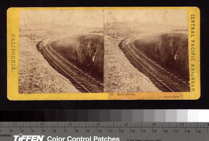 This collection contains 372 stereographic photographs (including some variants and duplicates) by photographer A. A. Hart that document the construction of the western half of first transcontinental railroad by the Central Pacific Railroad between 1864 and 1869. The collection includes all but seven of the original series, numbered from 1 to 364 by Hart (lacking 193, 323, 333, 358, 359, 362, and 364). The images chronicle the advancement of the railroad over 742 miles in California and the Sierra Nevada Mountains, Nevada, and Utah. The majority of the photographs are views of mountains, lakes, rivers, and forested areas (some with stumps from clear-cutting in the foreground), often with railroad tracks running through the center of the images. In addition, there are also images of locomotives, Chinese and other workers, equipment, bridges, tunnels, frontier and mining towns, construction camps, as well as some images of Native Americans, including Paiute and Shoshone Indians. The stereographs primarily contain Hart's own Sacramento imprint with series titles including: "Scenes in the Sierra Nevada Mountains"; "Scenes in the Valley of the Sacramento"; "Scenes in the Washoe Range"; "Scenes on the Humboldt River"; and "Scenes near Great Salt Lake". Interspersed in the collection are stereographs published without credit to Hart by Frank Durgan and Carleton E. Watkins.