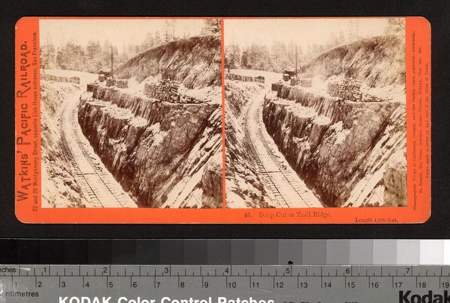 This collection contains 372 stereographic photographs (including some variants and duplicates) by photographer A. A. Hart that document the construction of the western half of first transcontinental railroad by the Central Pacific Railroad between 1864 and 1869. The collection includes all but seven of the original series, numbered from 1 to 364 by Hart (lacking 193, 323, 333, 358, 359, 362, and 364). The images chronicle the advancement of the railroad over 742 miles in California and the Sierra Nevada Mountains, Nevada, and Utah. The majority of the photographs are views of mountains, lakes, rivers, and forested areas (some with stumps from clear-cutting in the foreground), often with railroad tracks running through the center of the images. In addition, there are also images of locomotives, Chinese and other workers, equipment, bridges, tunnels, frontier and mining towns, construction camps, as well as some images of Native Americans, including Paiute and Shoshone Indians. The stereographs primarily contain Hart's own Sacramento imprint with series titles including: "Scenes in the Sierra Nevada Mountains"; "Scenes in the Valley of the Sacramento"; "Scenes in the Washoe Range"; "Scenes on the Humboldt River"; and "Scenes near Great Salt Lake". Interspersed in the collection are stereographs published without credit to Hart by Frank Durgan and Carleton E. Watkins.