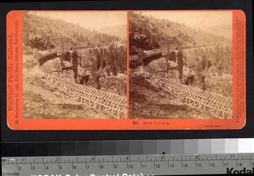 This collection contains 372 stereographic photographs (including some variants and duplicates) by photographer A. A. Hart that document the construction of the western half of first transcontinental railroad by the Central Pacific Railroad between 1864 and 1869. The collection includes all but seven of the original series, numbered from 1 to 364 by Hart (lacking 193, 323, 333, 358, 359, 362, and 364). The images chronicle the advancement of the railroad over 742 miles in California and the Sierra Nevada Mountains, Nevada, and Utah. The majority of the photographs are views of mountains, lakes, rivers, and forested areas (some with stumps from clear-cutting in the foreground), often with railroad tracks running through the center of the images. In addition, there are also images of locomotives, Chinese and other workers, equipment, bridges, tunnels, frontier and mining towns, construction camps, as well as some images of Native Americans, including Paiute and Shoshone Indians. The stereographs primarily contain Hart's own Sacramento imprint with series titles including: "Scenes in the Sierra Nevada Mountains"; "Scenes in the Valley of the Sacramento"; "Scenes in the Washoe Range"; "Scenes on the Humboldt River"; and "Scenes near Great Salt Lake". Interspersed in the collection are stereographs published without credit to Hart by Frank Durgan and Carleton E. Watkins.