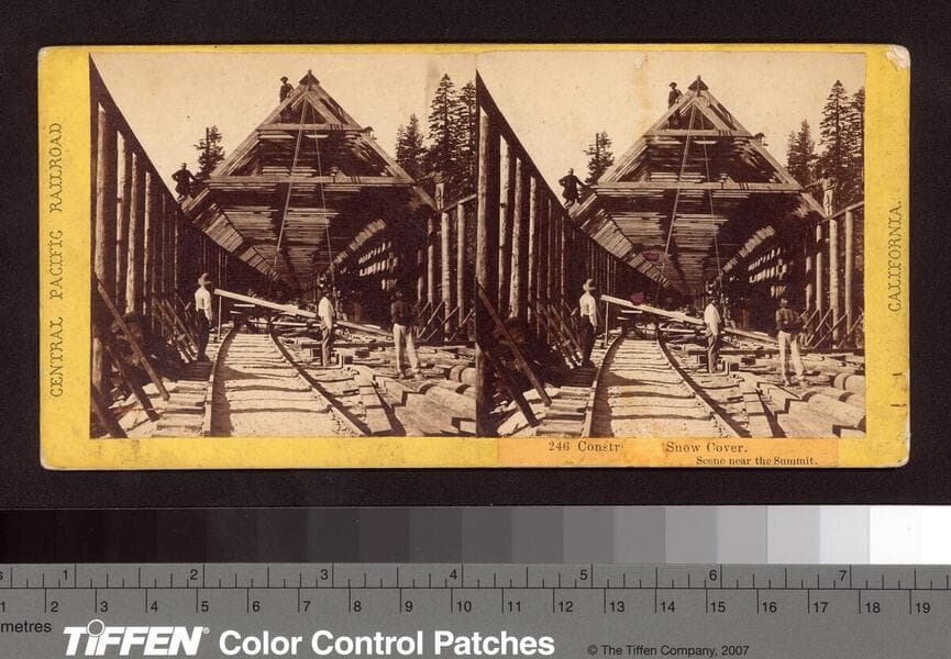 This collection contains 372 stereographic photographs (including some variants and duplicates) by photographer A. A. Hart that document the construction of the western half of first transcontinental railroad by the Central Pacific Railroad between 1864 and 1869. The collection includes all but seven of the original series, numbered from 1 to 364 by Hart (lacking 193, 323, 333, 358, 359, 362, and 364). The images chronicle the advancement of the railroad over 742 miles in California and the Sierra Nevada Mountains, Nevada, and Utah. The majority of the photographs are views of mountains, lakes, rivers, and forested areas (some with stumps from clear-cutting in the foreground), often with railroad tracks running through the center of the images. In addition, there are also images of locomotives, Chinese and other workers, equipment, bridges, tunnels, frontier and mining towns, construction camps, as well as some images of Native Americans, including Paiute and Shoshone Indians. The stereographs primarily contain Hart's own Sacramento imprint with series titles including: "Scenes in the Sierra Nevada Mountains"; "Scenes in the Valley of the Sacramento"; "Scenes in the Washoe Range"; "Scenes on the Humboldt River"; and "Scenes near Great Salt Lake". Interspersed in the collection are stereographs published without credit to Hart by Frank Durgan and Carleton E. Watkins.