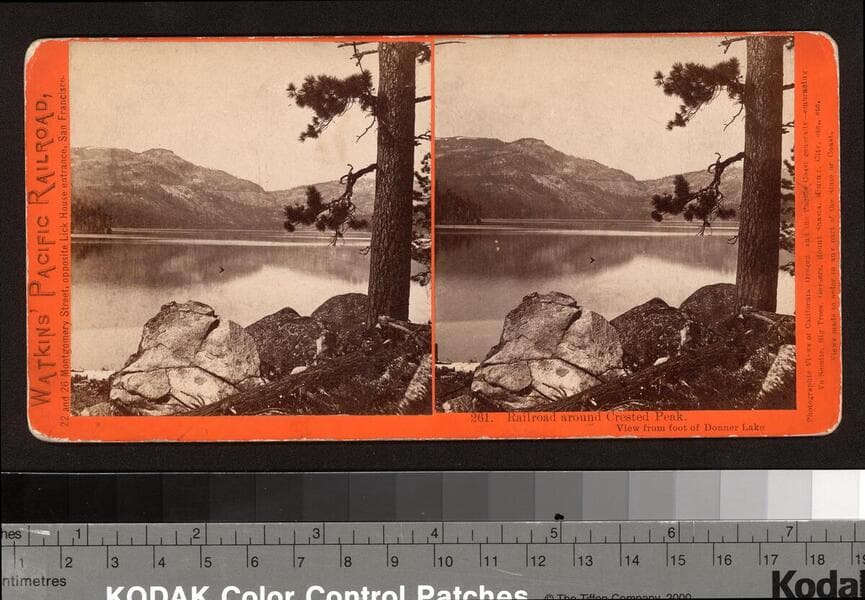 This collection contains 372 stereographic photographs (including some variants and duplicates) by photographer A. A. Hart that document the construction of the western half of first transcontinental railroad by the Central Pacific Railroad between 1864 and 1869. The collection includes all but seven of the original series, numbered from 1 to 364 by Hart (lacking 193, 323, 333, 358, 359, 362, and 364). The images chronicle the advancement of the railroad over 742 miles in California and the Sierra Nevada Mountains, Nevada, and Utah. The majority of the photographs are views of mountains, lakes, rivers, and forested areas (some with stumps from clear-cutting in the foreground), often with railroad tracks running through the center of the images. In addition, there are also images of locomotives, Chinese and other workers, equipment, bridges, tunnels, frontier and mining towns, construction camps, as well as some images of Native Americans, including Paiute and Shoshone Indians. The stereographs primarily contain Hart's own Sacramento imprint with series titles including: "Scenes in the Sierra Nevada Mountains"; "Scenes in the Valley of the Sacramento"; "Scenes in the Washoe Range"; "Scenes on the Humboldt River"; and "Scenes near Great Salt Lake". Interspersed in the collection are stereographs published without credit to Hart by Frank Durgan and Carleton E. Watkins.