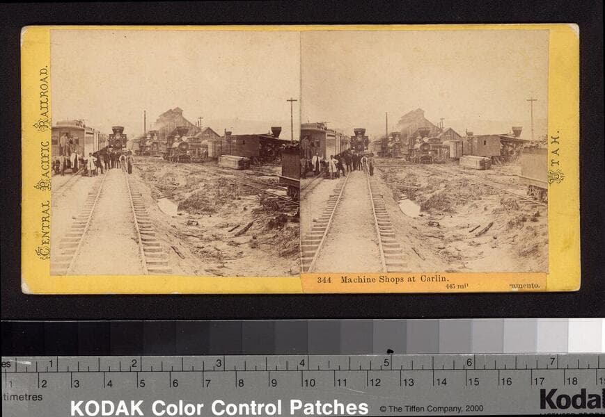 This collection contains 372 stereographic photographs (including some variants and duplicates) by photographer A. A. Hart that document the construction of the western half of first transcontinental railroad by the Central Pacific Railroad between 1864 and 1869. The collection includes all but seven of the original series, numbered from 1 to 364 by Hart (lacking 193, 323, 333, 358, 359, 362, and 364). The images chronicle the advancement of the railroad over 742 miles in California and the Sierra Nevada Mountains, Nevada, and Utah. The majority of the photographs are views of mountains, lakes, rivers, and forested areas (some with stumps from clear-cutting in the foreground), often with railroad tracks running through the center of the images. In addition, there are also images of locomotives, Chinese and other workers, equipment, bridges, tunnels, frontier and mining towns, construction camps, as well as some images of Native Americans, including Paiute and Shoshone Indians. The stereographs primarily contain Hart's own Sacramento imprint with series titles including: "Scenes in the Sierra Nevada Mountains"; "Scenes in the Valley of the Sacramento"; "Scenes in the Washoe Range"; "Scenes on the Humboldt River"; and "Scenes near Great Salt Lake". Interspersed in the collection are stereographs published without credit to Hart by Frank Durgan and Carleton E. Watkins.