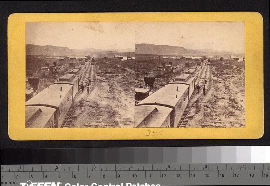 This collection contains 372 stereographic photographs (including some variants and duplicates) by photographer A. A. Hart that document the construction of the western half of first transcontinental railroad by the Central Pacific Railroad between 1864 and 1869. The collection includes all but seven of the original series, numbered from 1 to 364 by Hart (lacking 193, 323, 333, 358, 359, 362, and 364). The images chronicle the advancement of the railroad over 742 miles in California and the Sierra Nevada Mountains, Nevada, and Utah. The majority of the photographs are views of mountains, lakes, rivers, and forested areas (some with stumps from clear-cutting in the foreground), often with railroad tracks running through the center of the images. In addition, there are also images of locomotives, Chinese and other workers, equipment, bridges, tunnels, frontier and mining towns, construction camps, as well as some images of Native Americans, including Paiute and Shoshone Indians. The stereographs primarily contain Hart's own Sacramento imprint with series titles including: "Scenes in the Sierra Nevada Mountains"; "Scenes in the Valley of the Sacramento"; "Scenes in the Washoe Range"; "Scenes on the Humboldt River"; and "Scenes near Great Salt Lake". Interspersed in the collection are stereographs published without credit to Hart by Frank Durgan and Carleton E. Watkins.