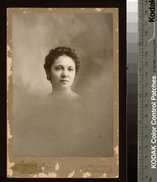 A bust-length studio portrait of Edith Octavia Shorb as a young woman, with her body turned very slightly to the left. Her straight, dark hair is pulled back, and she is wearing a white blouse or dress with a high neck and slightly puffy sleeves.