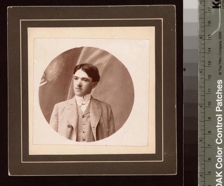 A bust length studio portrait of Joseph Campbell Shorb as a young man, with his body turned very slightly to the left. He is wearing a medium-dark suit and a checked tie. He has short dark hair parted just left of center.